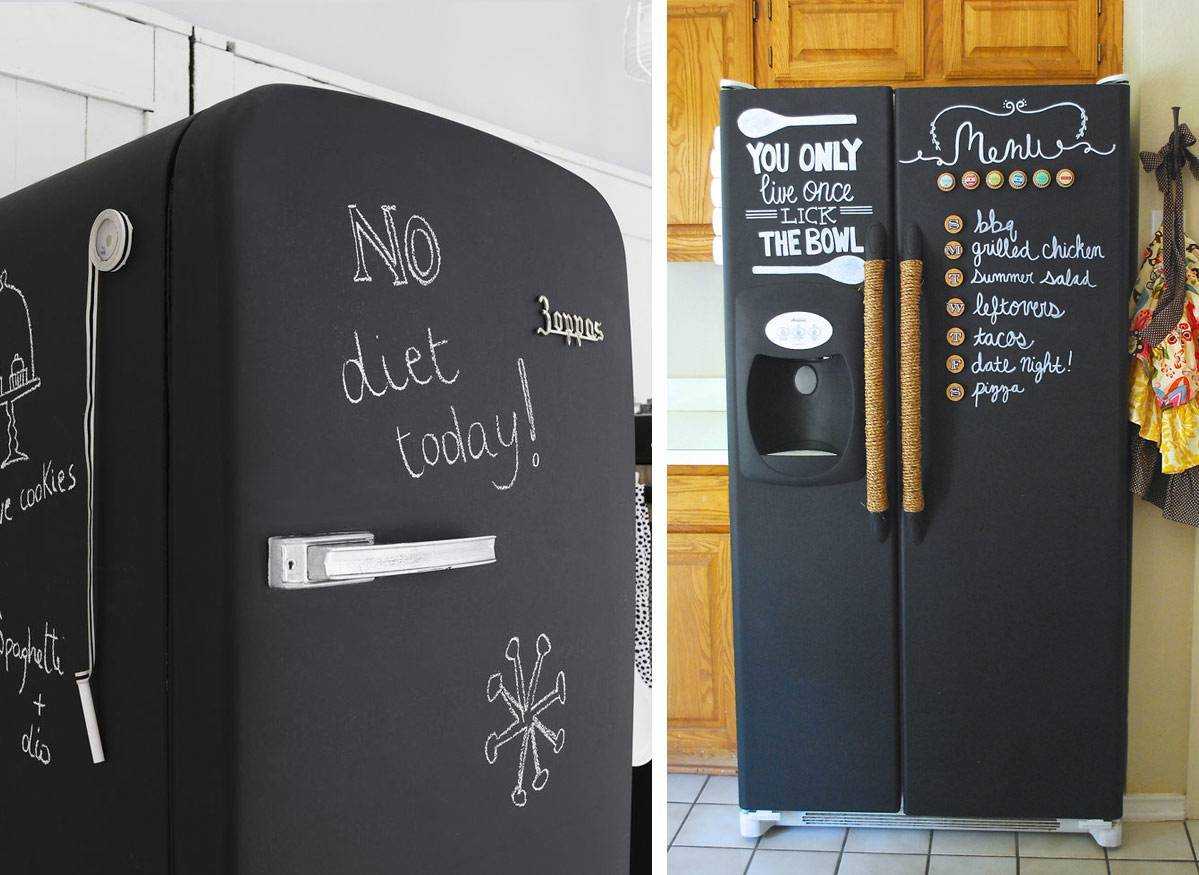 Дверца холодильника с грифельным покрытием – это идеальное место для записей: списков покупок и дел, рецептов и напоминалок, посланий домочадцам и милых заметок. И, конечно, на такой «доске» очень удобно рисовать детям, пока мама готовит. Чтобы превратить дверцы холодильника в доски для записей вы можете выбрать один из четырёх способов: • Покраска грифельной краской • Отделка меловыми обоями. • Крепление магнитно-грифельной доски. • Крепление грифельной доски на неодимовые магниты.