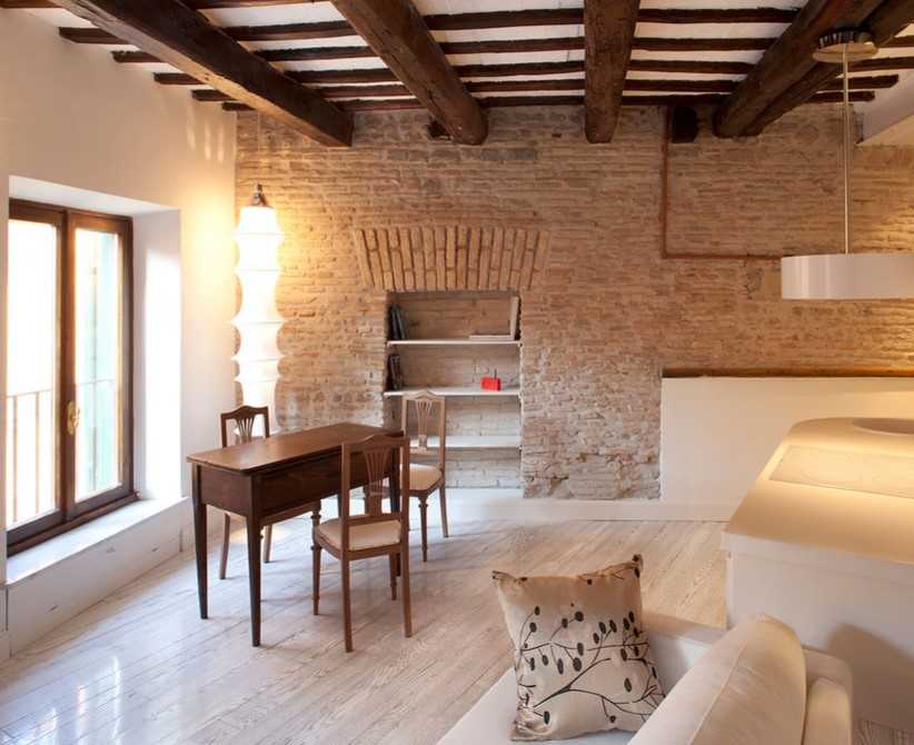 Если дом сложен из кирпича, то одну из стен можно либо оставить “как есть” в случае, если квартира без отделки, либо зачистить до кладки, если отделка уже сделана. В любом случае для превращения кладки в предмет декора необходимы специальные работы.