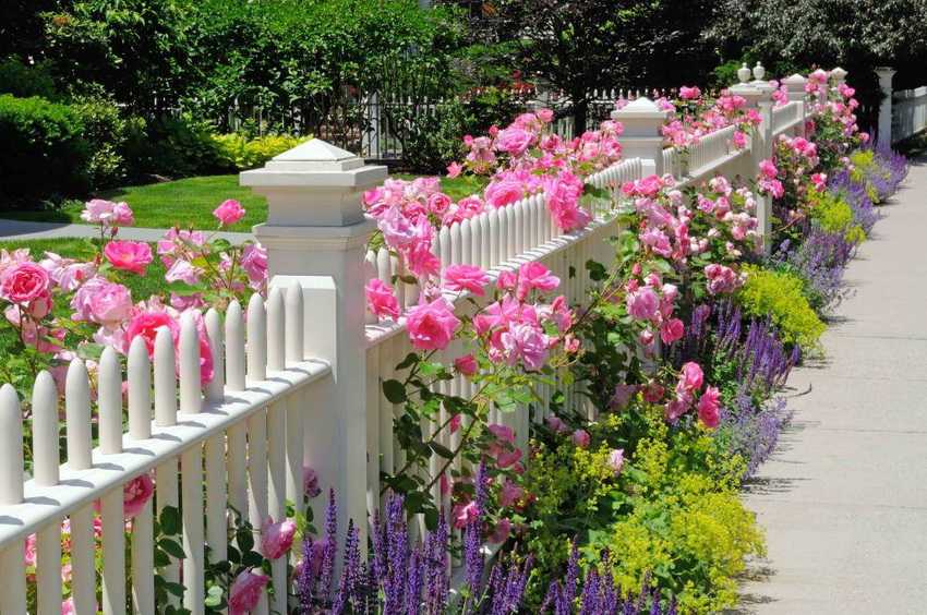 Белый классический забор часто сочетают с розами и другими цветами, что придает участку праздничный вид