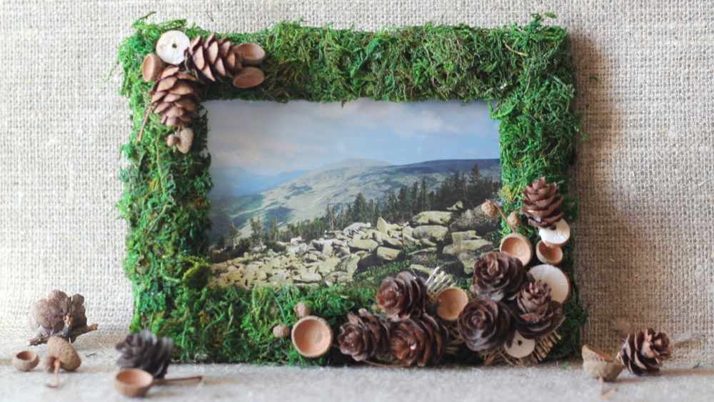 - Рамки для фотографий, картин, панно или зеркал. Для декора рамок отлично подходят желуди, каштаны, шишки, веточки, галька, сухоцветы, сушеные фрукты, береста.