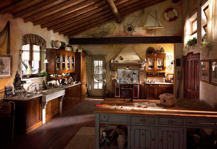 Потолок в средиземноморском стиле отделывают балками, а столешница и пол на кухне покрываются керамической плиткой. Чудесной идеей станет выбор разноцветной плитки: так вы по максимуму передадите атмосферу традиционных итальянских домиков. Цветовая гамма: персиковый, теплый зеленый, оранжевый и охристо-коричневый.