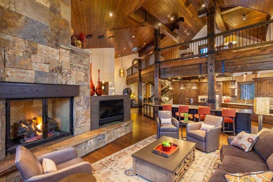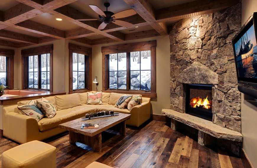 Центр гостиной – красивый камин с каменной отделкой, на стенах – ковры, гобелены, шкуры животных. Оригинально выглядит расположенная рядом с камином небольшая поленница дров, рядом – массивная мебель с обивкой из кожи или грубой ткани. Для колорита предметы в интерьере специально состаривают, применяя патину и другие техники. Основные цвета стиля шале: терракота, охра, коричневый с вкраплениями зеленого, белого, синего.