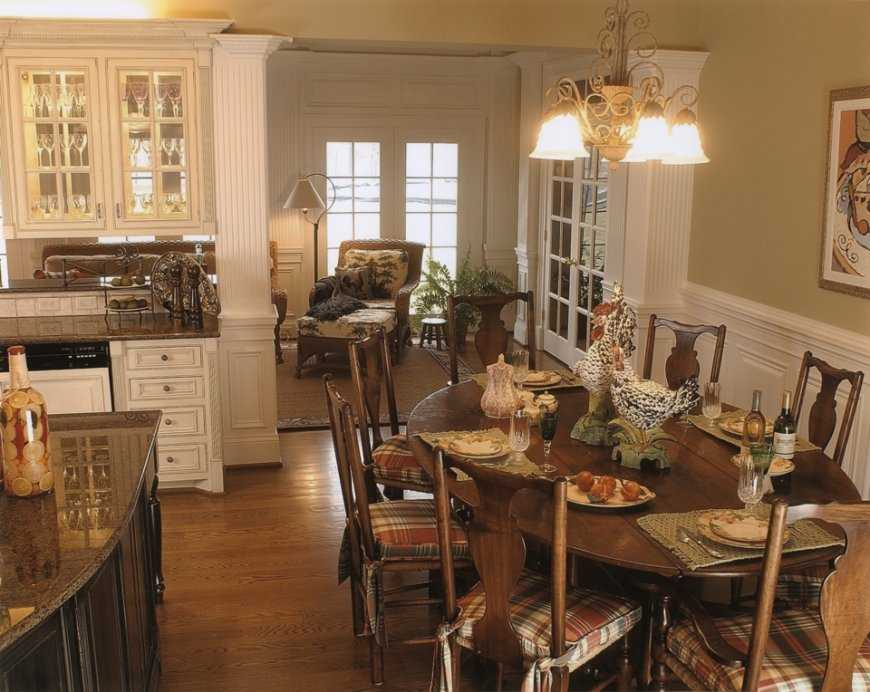 Кантри – это множество текстиля, уютная зона отдыха перед камином, практичная добротная мебель. Очарование пространству придает ручная вышивка, плетеные и кованые предметы, коврики.