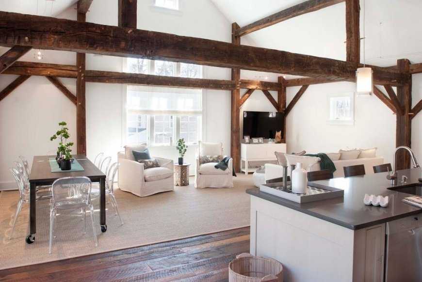 На заметку!Обязательный элемент пространств в стиле шале – массивные потолочные балки. Они могут быть настоящими или декоративными, но на контрасте с общим фоном потолка.