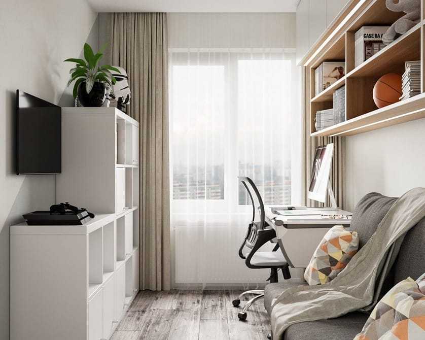 Если у вас появился ребенок, рано или поздно придется решать проблему совмещения гостиной с детской комнатой. Но сначала надо учесть обязательное приобретение удобного письменного стола, полок (стеллажей) для художественной и учебной литературы и других составляющих предметов.