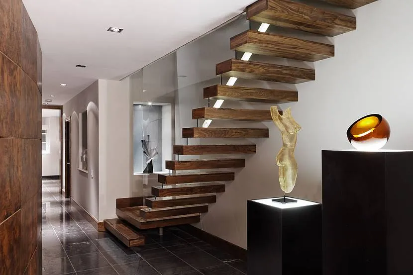 - К модерну подойду невесомые лестницы. Конструкция включает в себя «парящие» ступени, прикрепленные без видимых силовых элементов к стене или на больцах.
