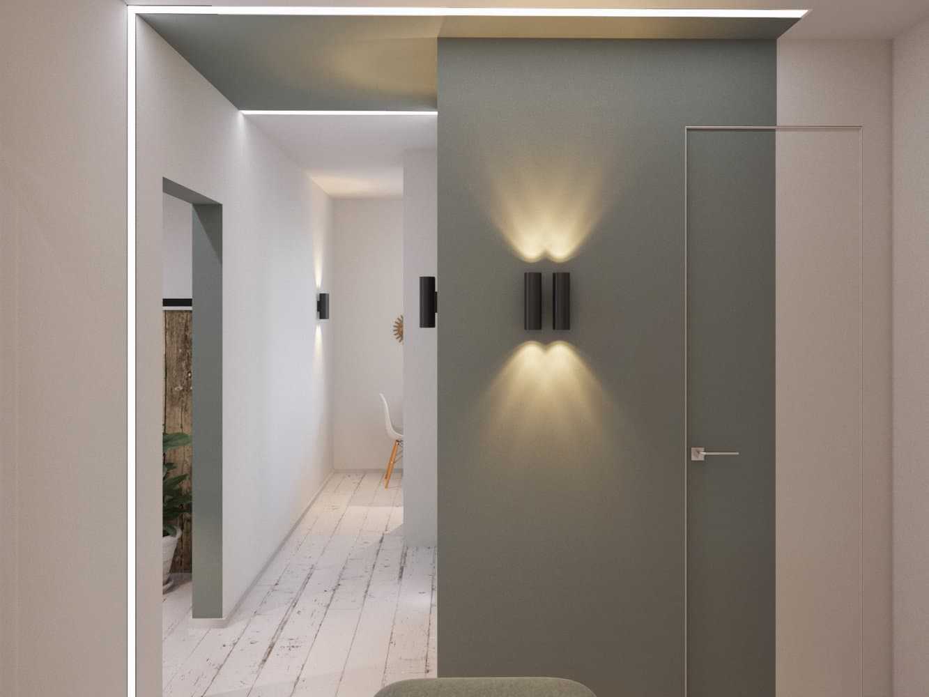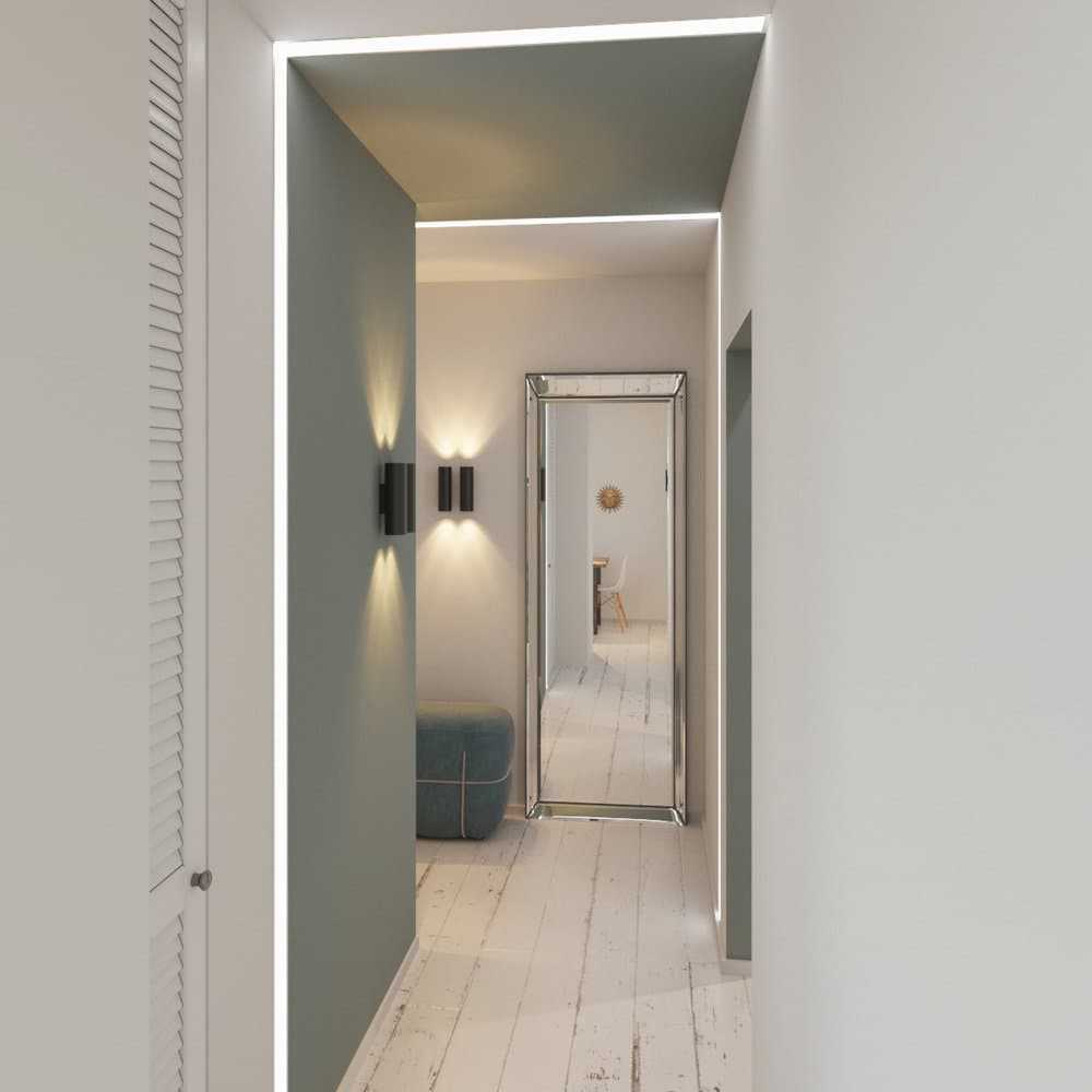 Коридор — двигаемся дальше, и после прихожей нас встречает коридор, который очень сильно напоминает планировку из двухкомнатной квартиры распашонки. Посмотрите на левый угол. Точь в точь, и вытяжка расположена на том же месте только в углу меньше места по комнатной стене.