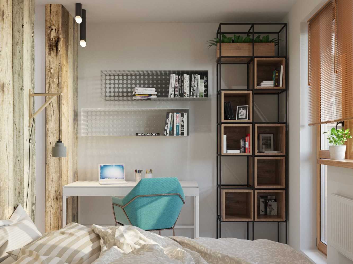 Разграничить зону спальни и гостиной можно с помощью перегородки со сквозным стеллажом, на котором уместно хранить книги или рабочие документы.