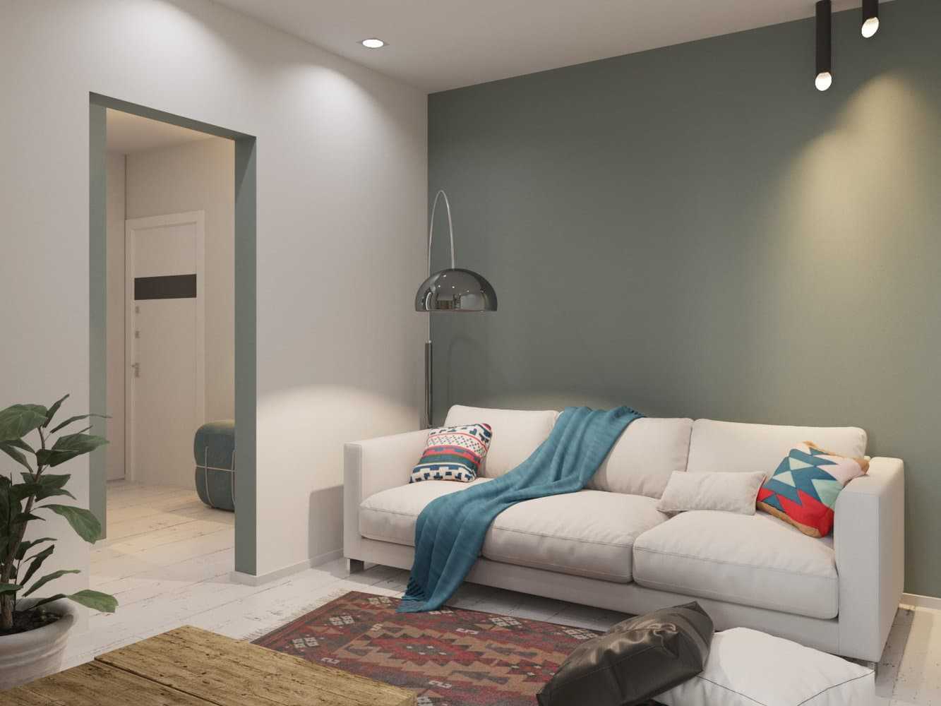 Для данного варианта я предлагаю разделить жилую комнату перегородкой. В результате мы получим кабинет и спальню. В рабочей зоне разместится диван.