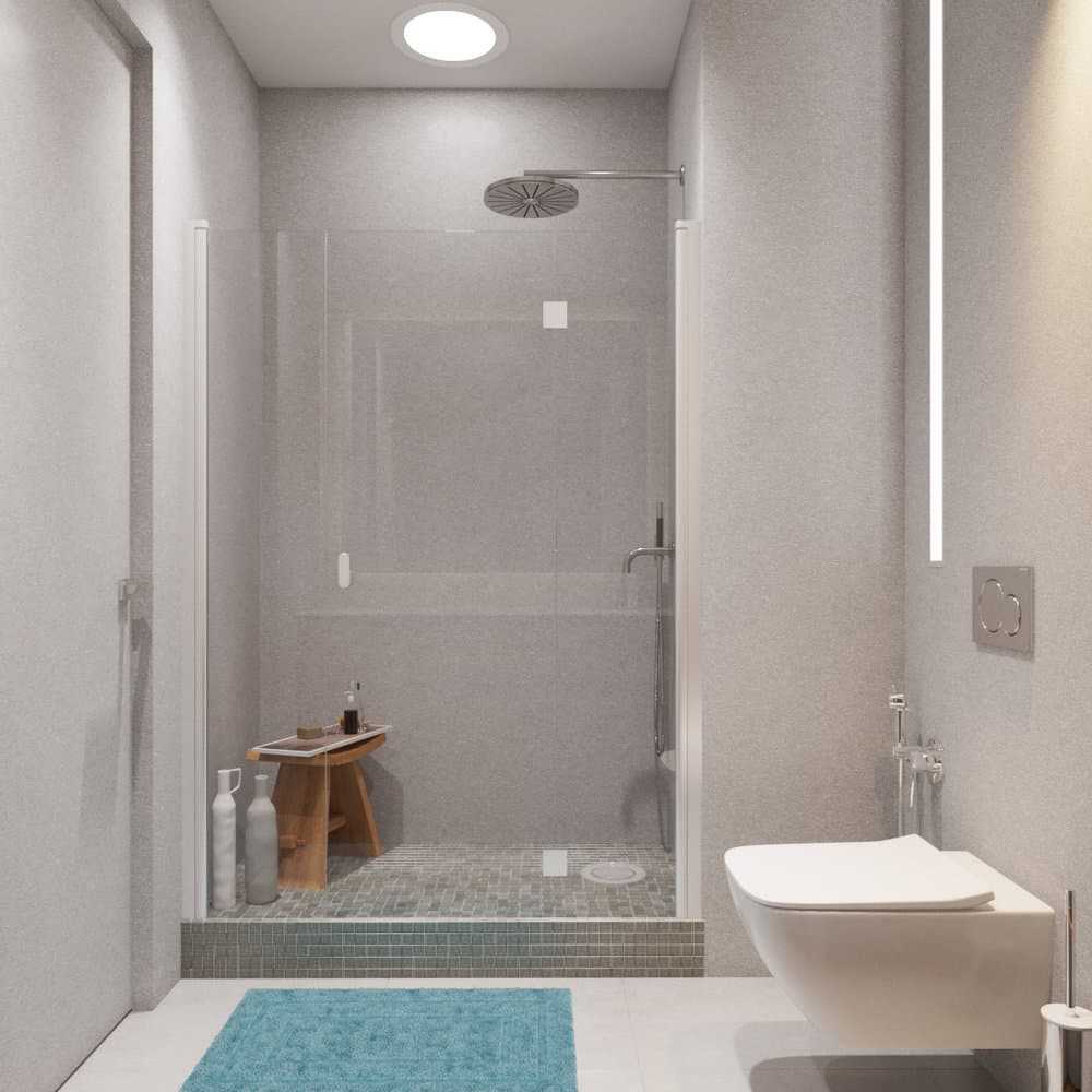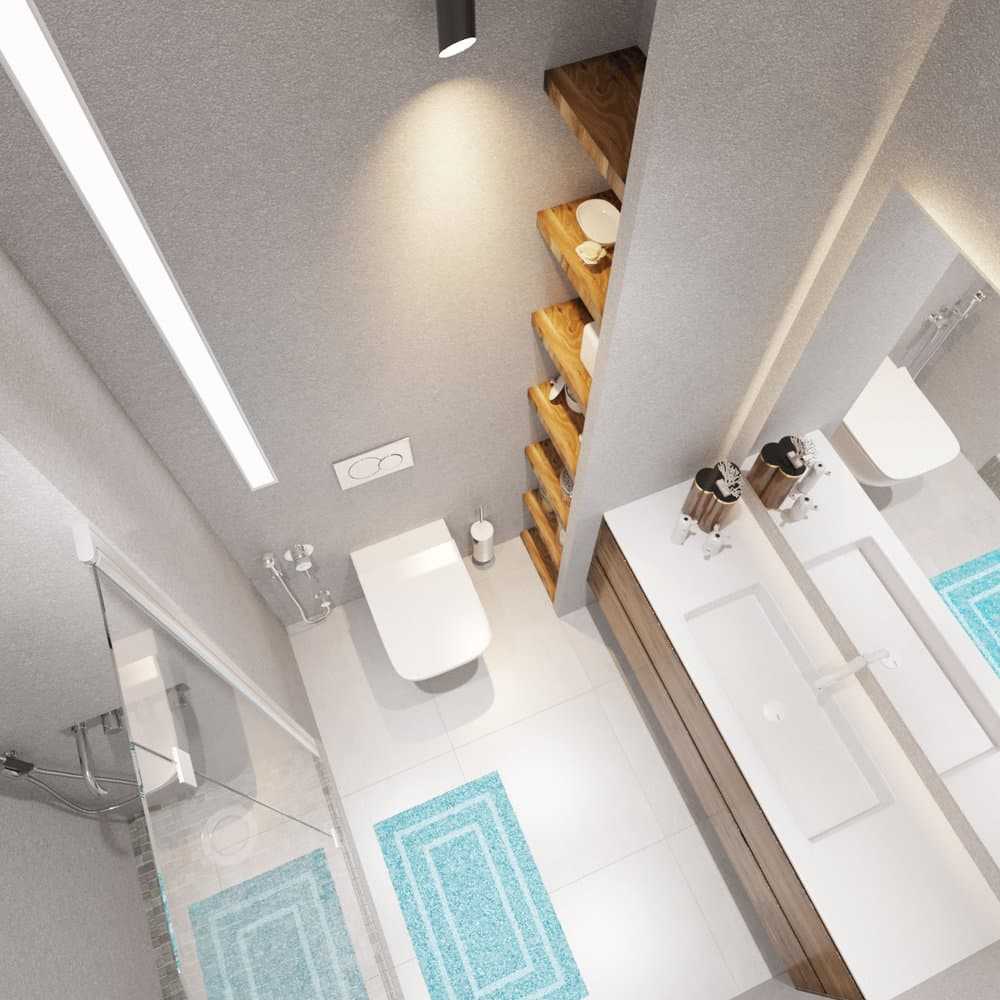 Дизайн-проект санузла предполагает замену ванны душевой кабинкой, за счет освободившейся площади найдется место для большого умывальника и стиральной машины.