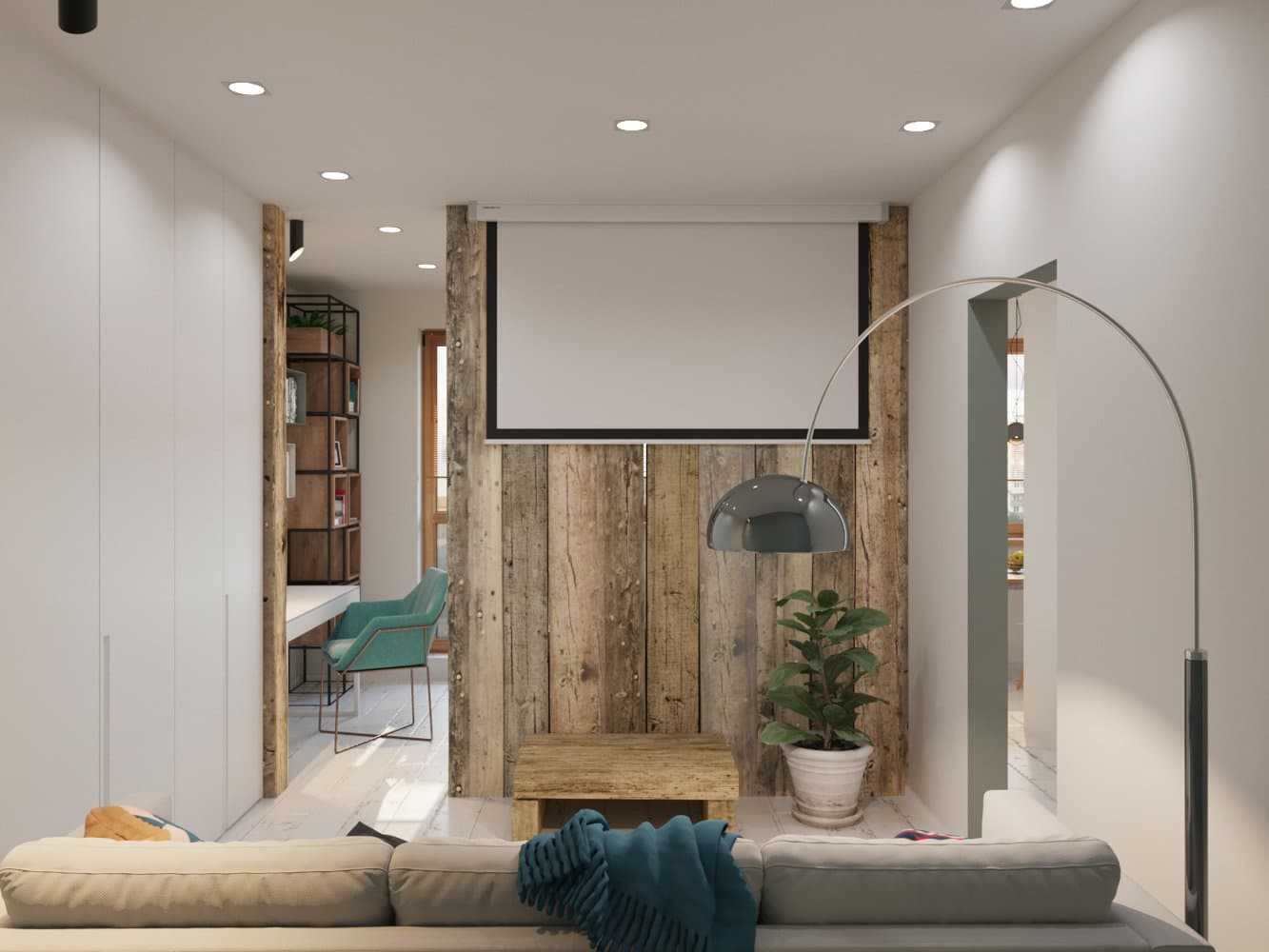 Даже такой приземленный стиль как эко может получиться легким и не перегруженным благодаря светлой цветовой гамме (общей для всей квартиры). Концепт интерьера основывается на минимуме текстур и элементов: дерево грубой обработки, окрашенные стены, максимально встроенные системы хранения. Так, шкафы в гостиной настолько незаметны, что визуально полностью заменяют собой одну из стен. Интересно, что в качестве перегородки между гостиной и спальней использованы необработанные доски, а вместо телевизора — экран для проектора, который можно раскрыть или спрятать в любой момент.