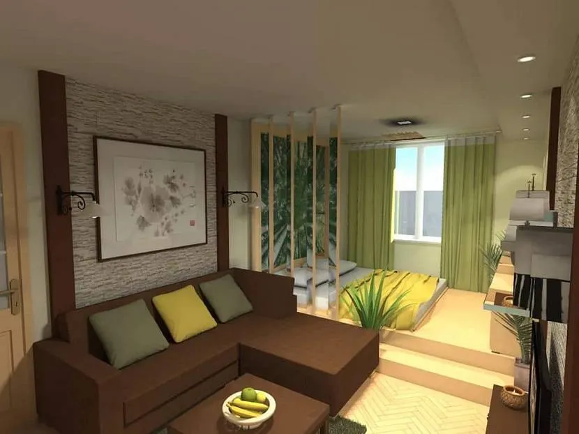 При грамотном подходе можно не только обозначить место для сна, но выделаить место для встречи гостей. С помощью перегородки в таком случае можно будет разграничить пространство.