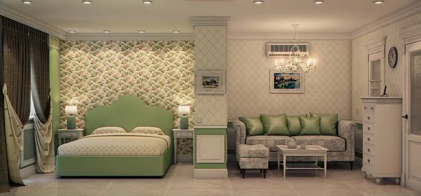 Спальня-гостиная в стиле Прованс позволяет декорировать помещение легкими моделями корпусной мебели, текстилем и обоям с цветочным принтом. Для зонирования можно поставить складную ширму. Легкое оформление, навеянное деревенскими мотивами, идеально подходит для дизайна интерьера комнаты с совмещёнными функциональными зонами.
