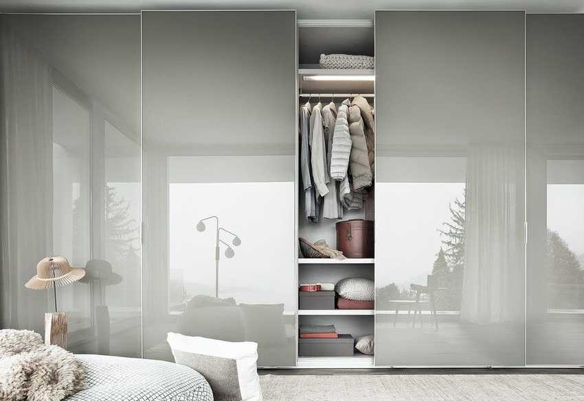 Гардеробную можно устроить вдоль стены и отделить ее раздвижными дверями, а внутри установить вешалки и полки. Такая конструкция отличается от шкафа-купе своими размерами и позволяет сделать в комнате интересный визуальный акцент за счет оригинальной текстуры дверей.