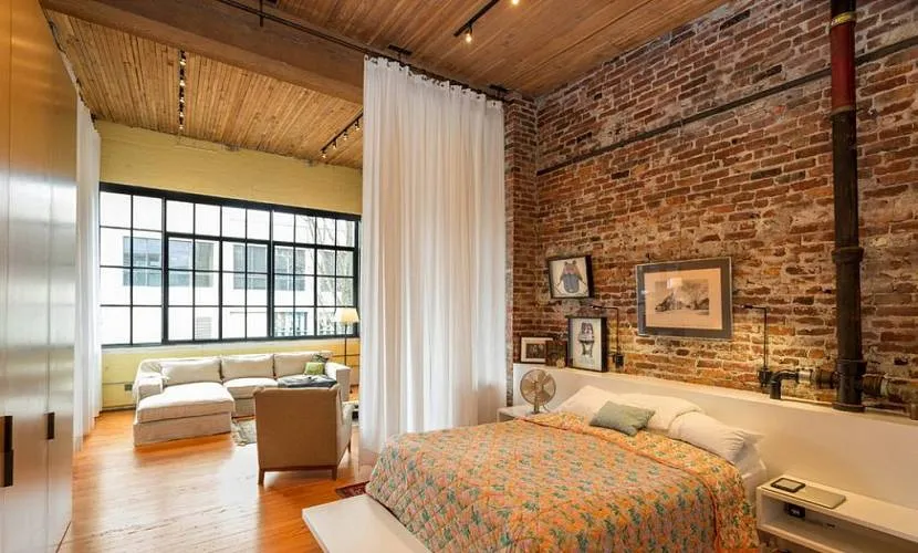 Стиле лофт допускает для зонирования комнаты использовать перегородки, потолочные балки и отделку стен кирпичной кладкой. Получится свободный и стильный интерьер с характером.