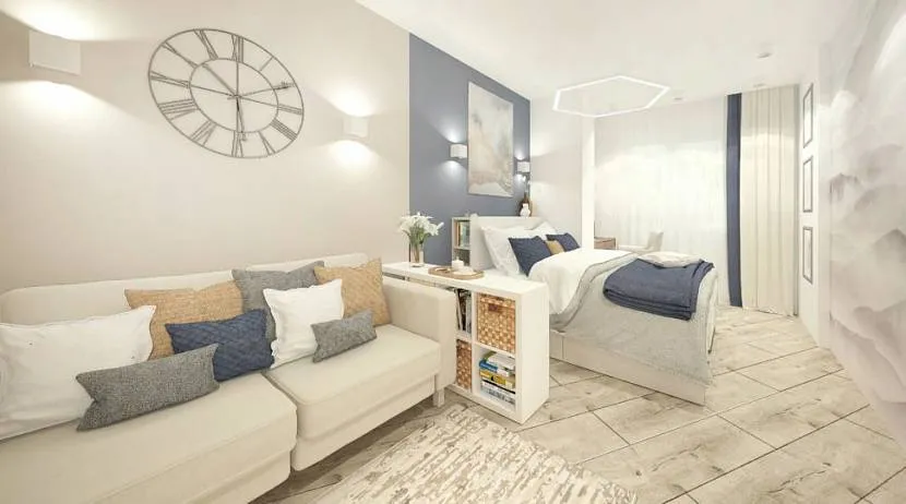 Чтобы не тратить время на ежедневную возню с мебелью, важно правильно разделить пространство на зоны для сна и приёма гостей. Применяя различные дизайнерские приёмы, можно создать такой интерьер, что спальная и гостевая зоны будут создавать единую композицию, не мешая друг другу