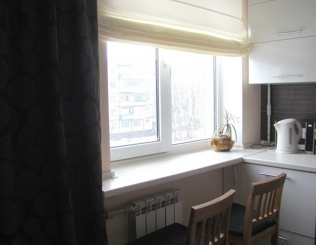 Диван на ночь раскладывается, получается комфортное место для сна. Подоконник в гостиной заменен столешницей, которая служит и обеденной зоной, и рабочим столом домашнего офиса.
