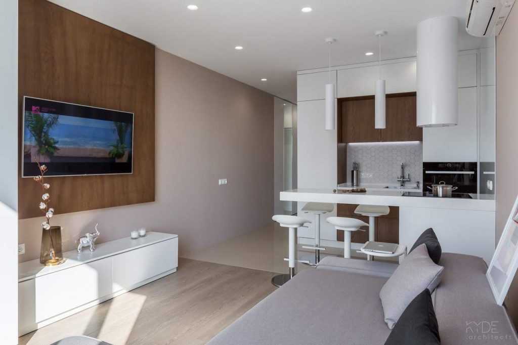В данной студии 28 кв. м выполнен дизайн в современном стиле. Это помещение вместило в себя зону кухни, гостиной и спальни.