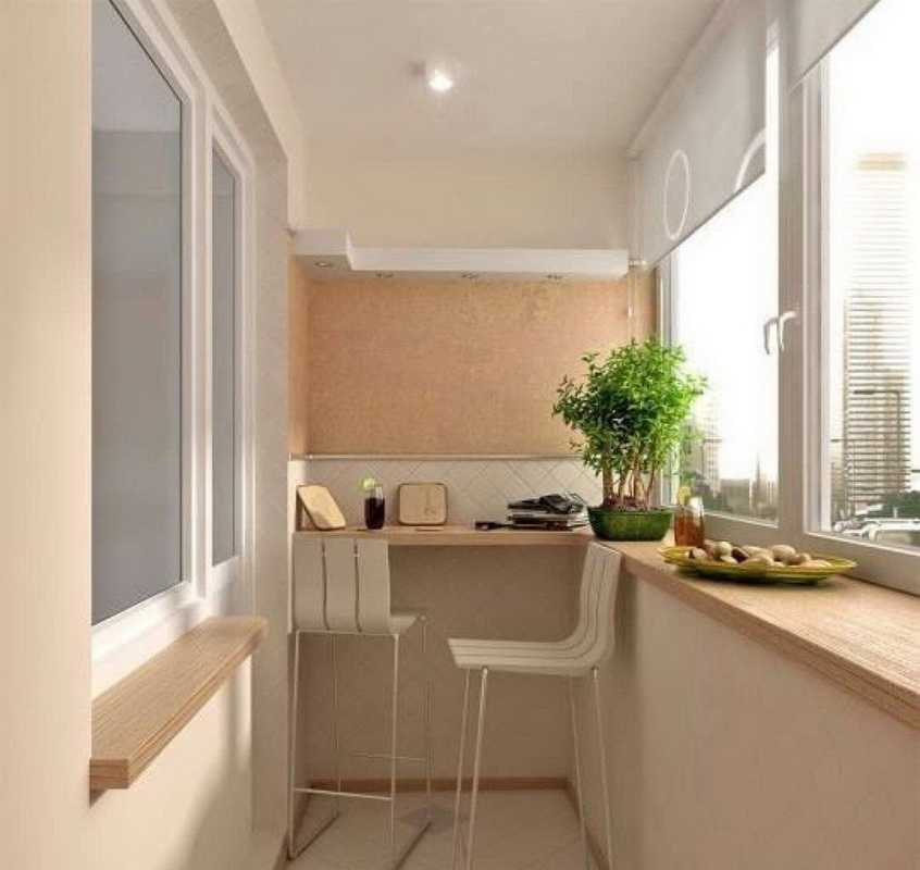 В качестве столешницы можно использовать широкий подоконник, а разместив под ним шкафы с выдвигающимися ящиками, вы получите полноценное рабочее место. В новостройках лоджия дает широкий простор для фантазии, так как ее площадь позволяет обустроить на ней рабочую зону, перенести обеденную, сэкономив тем самым место на кухне, или же сделать гардеробную – в зависимости от того, в какой из зон потребность больше. Чтобы использовать лоджию в течение всего года, проведите предварительные работы – ее необходимо утеплить, установить отопление (для обогрева можно использовать теплые полы, батарею) и остеклить.