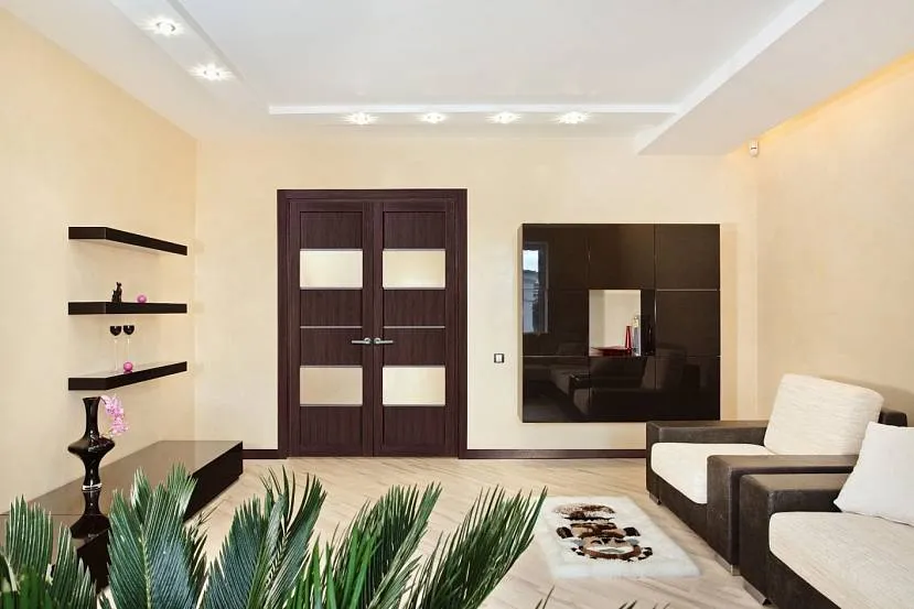 Для большой комнаты лучше выбрать в любом стиле двери, но с раздвижным механизмом или широкие, двухстворчатые. К мягкой палитре венге дизайнеры рекомендуют добавлять насыщенные гардины и темную мебель. Выбрать обои, наоборот, лучше пастельных тонов с мягким коричневым рисунком.
