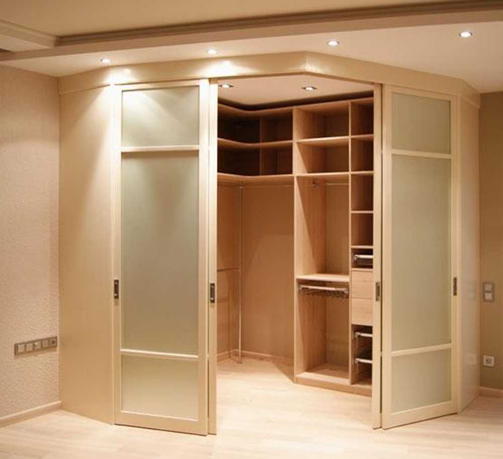 Угловой вариант. Такой вариант займет лишь один из углов помещения, в изголовье кровати. Дверь выбирают распашную или раздвижную. Вариант идеален для комнаты в виде квадрата.