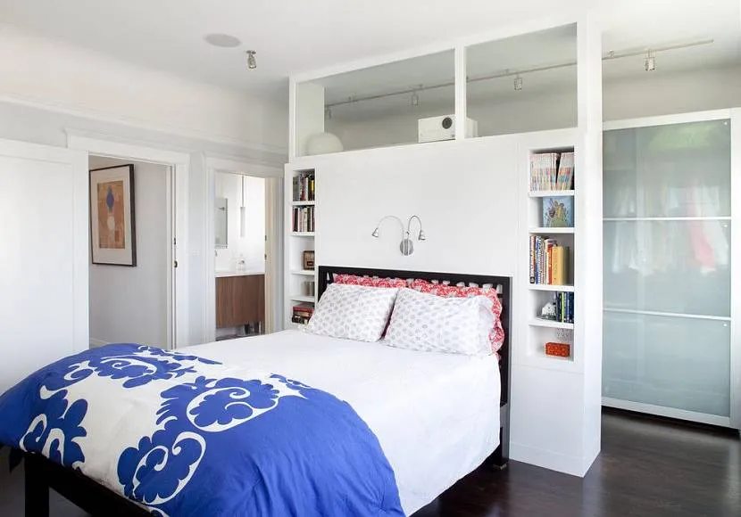 Вы также можете соорудить высокую и узкую стену — это может сделать спальню более просторной. Несовершенство этого решения, скорее всего, заключается в большем скоплении пыли в отдельном месте.
