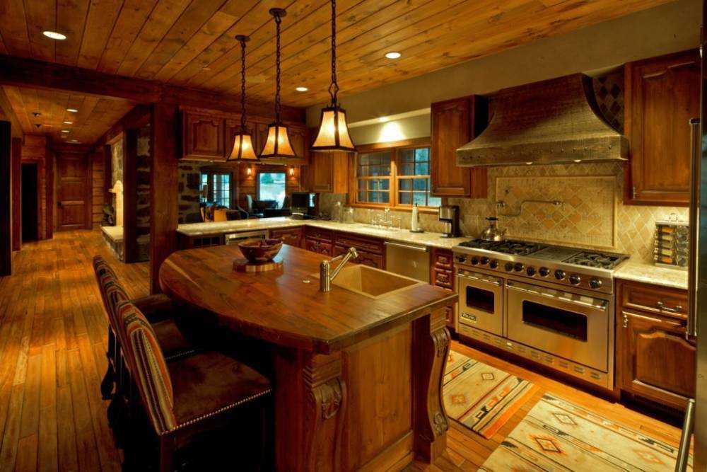 Главным центров внимания без сомнения становится деревянный, пропитанный маслом пол, мебель желательно располагать вдоль стен, избегая современного подхода к зонированию. Помните, что чем более близок внешний вид вашей кухни к старинным образцам, тем ближе вы к истинному пониманию стиля шале.
