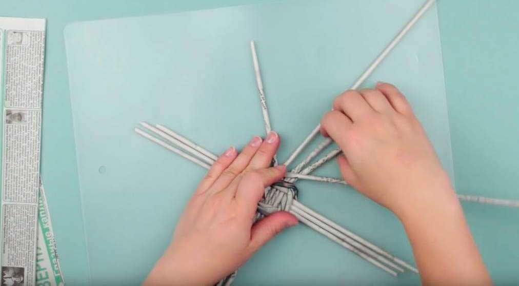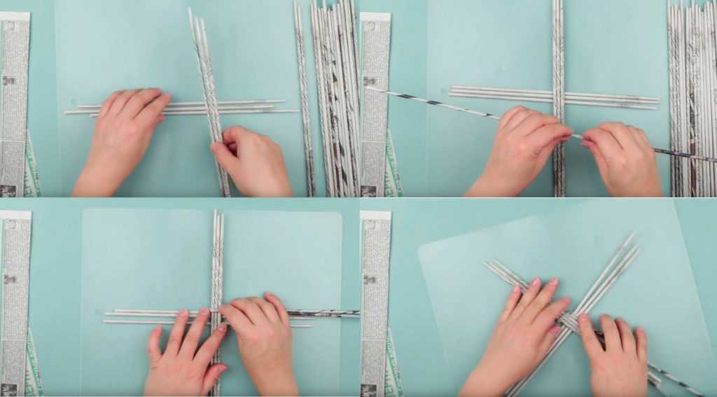 Начинать плетение нужно со дна. Для этого возьмите 4 трубочки и сложите крест-накрест. Сделайте вокруг двух основных 4 круга и согните. Таким образом нужно сделать 5-7 рядов.