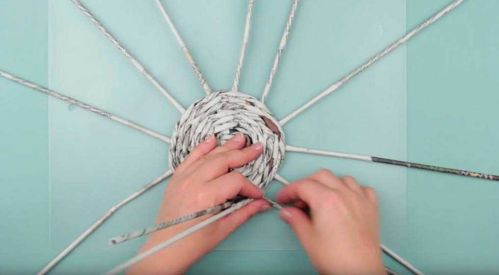 Продолжить в такой последовательности плетение дна корзинки, пока не появятся 2 ряда. Это необходимо делать по кругу, двигаясь по часовой стрелке. Ряды рекомендуется укладывать плотнее, чтобы не было щелей в дне корзинки. При необходимости наращивать ведущие трубочки, как делалось изначально.