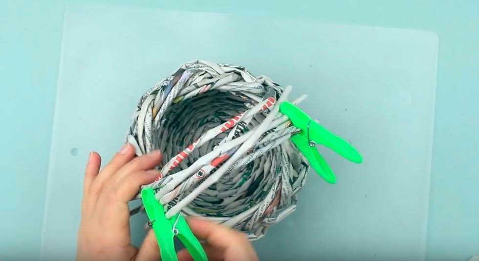 Также потребуются прищепки, чтобы закрепить дно на время его высыхания и тяжелые предметы, например гиря или стопка книг. Не лишней станет коробка, по размеру которой будет происходить оплетение корзины. Она добавит дну устойчивости и сделает корзину правильной формы.