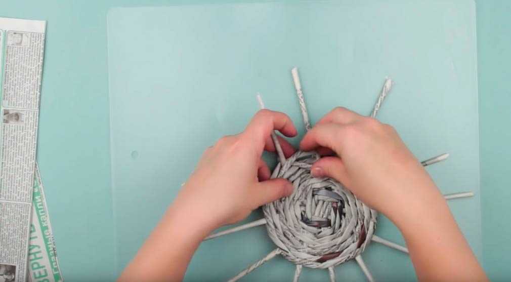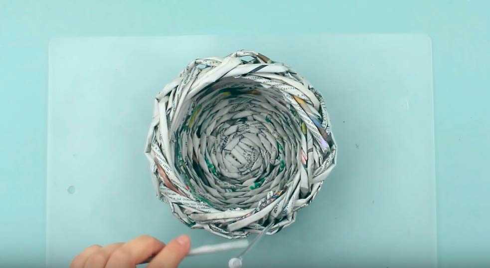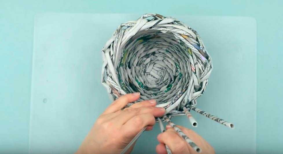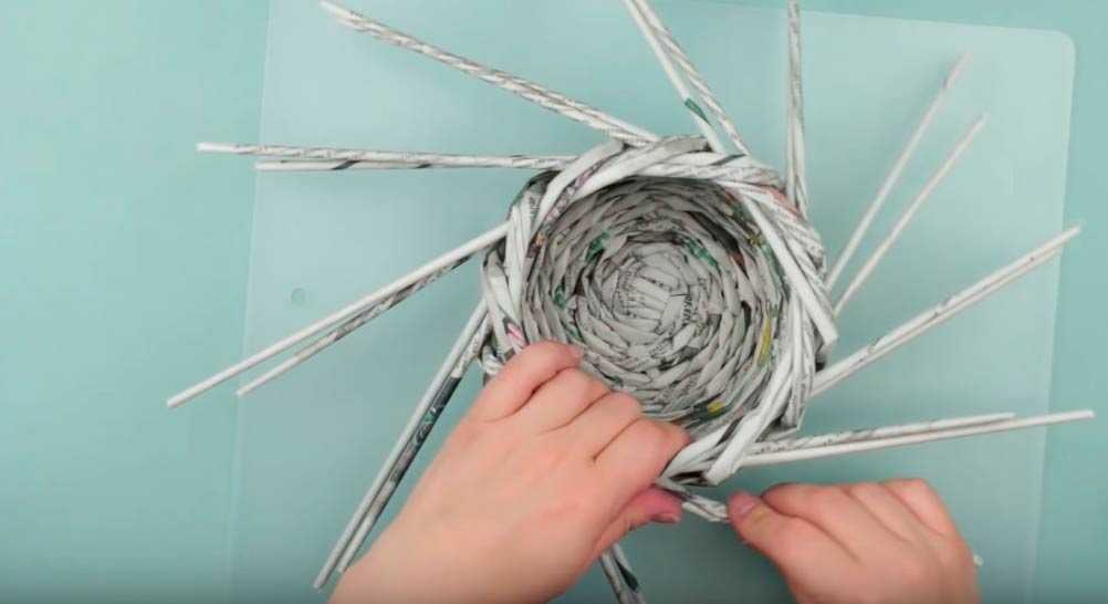 | Плетение дна | Сплетите в указанной технике 6 рядов, оплетая по 3 трубочки сразу, после чего начинайте оплетать по 1 свертке. Так необходимо плести до тех пор, пока не получится дно нужного диаметра. |