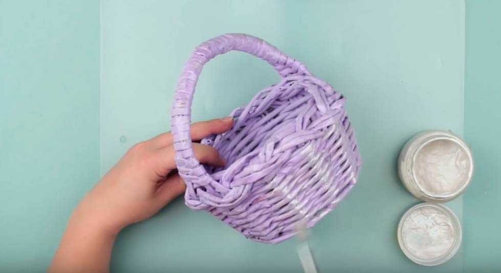 Приступить к покраске корзинки. Смешать в отдельной емкости гуашь, водоэмульсионную краску, грунтовку и клей ПВА в равных пропорциях. Покрыть получившейся смесью корзинку. В завершении нанести на подделку акриловый бесцветный лак и краску «Перламутр».