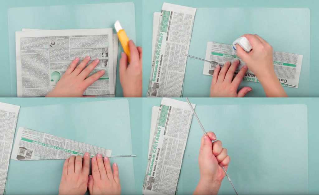 В первую очередь необходимо сделать трубочки из газет. Для этого необходимо сложить бумагу 8 раз и срезать линии сгиба. Взять одну полоску и нанести тонкий слой клея по краю. С помощью спицы плотно скрутить газетный лист. Это необходимо делать, начиная с угла. После этого аккуратно снять трубочку со спицы. Всего понадобится около 20 заготовок.