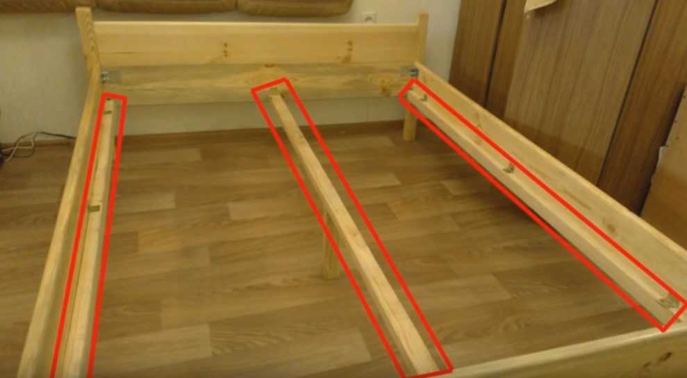 Для установки лаг, на которых будет лежать матрас, на поддерживающие планки можно прикрутить небольшие бруски, которые образуют пазы. Таким образом, каждая лага будет ложиться на свое место.