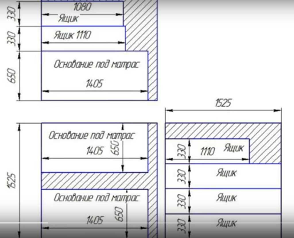 При этом границы своеобразного постамента могут быть как по размеру матраса, так и несколько больше. В последнем случае, выступающие части можно использовать в качестве своеобразного столика или полочки.
