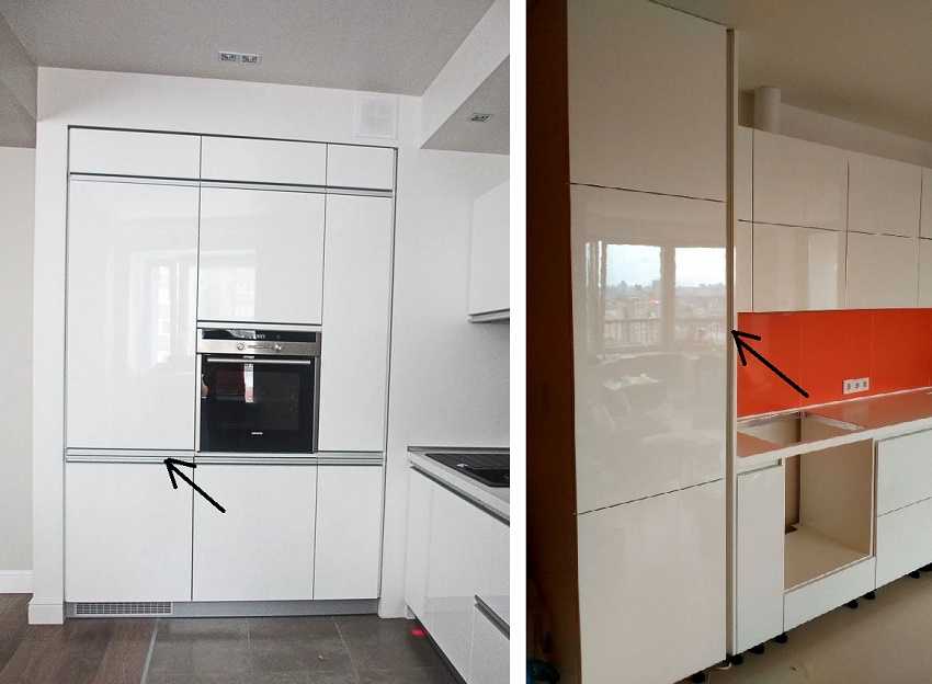 Последнее время популярностью пользуются так называемый профиль Gola в дизайне кухонной мебели без ручек. Первые накладываются на фасад, а вторые – встраиваются в корпус кухонных тумб и навесных шкафов. Для пеналов характерно вертикальное расположение ручек типа Gola – а значит, ширина шкафа для встроенного холодильника увеличится на ширину профильной ручки