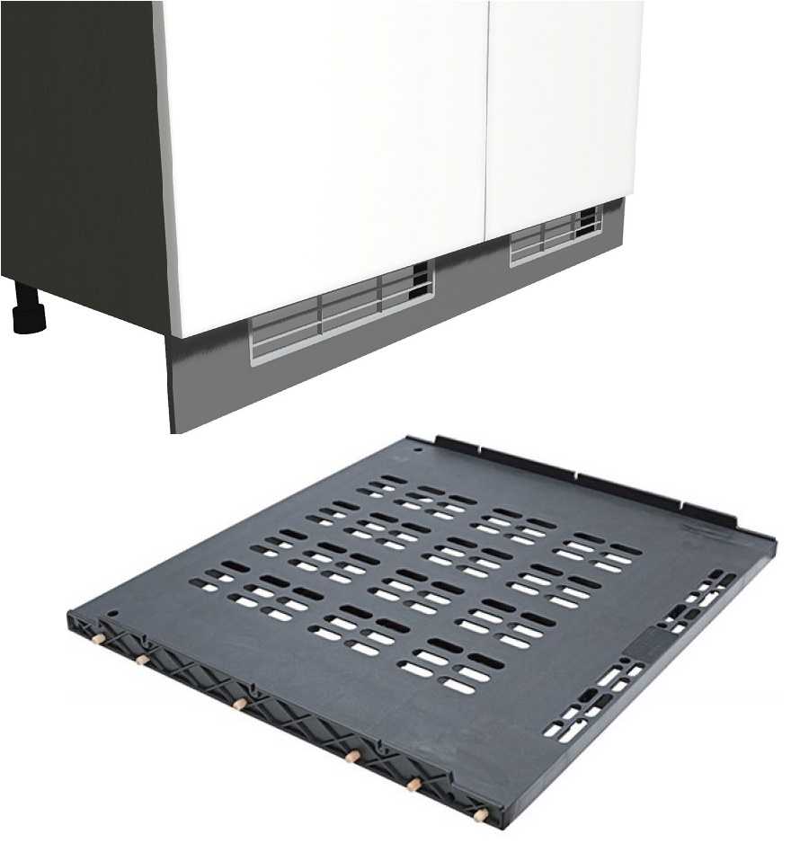 В качестве дна для шкафа под холодильник можно использовать специальный поддон с вентиляционными отверстиями. Обойдется он несколько дороже. Также в продаже кухонных комплектующих есть специальные вентиляционные решетки для оформления цоколя холодильника.