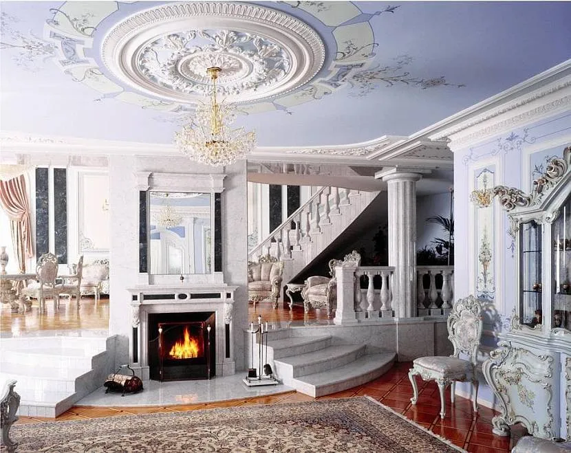 Стиль благоволит к шикарным материалам – редкому камню, ценным породам дерева, атласу, бархату, шелку. Полы покрывают наборным, мозаичным паркетом, стены обтягивают тканями, украшают декоративной штукатуркой, не запрещаются сегодня и обои – из тончайшего, натурального волокна. Потолки высокие, оснащенные плафонами и лепными карнизами. Как правило, их поддерживают колонны и полуколонны.