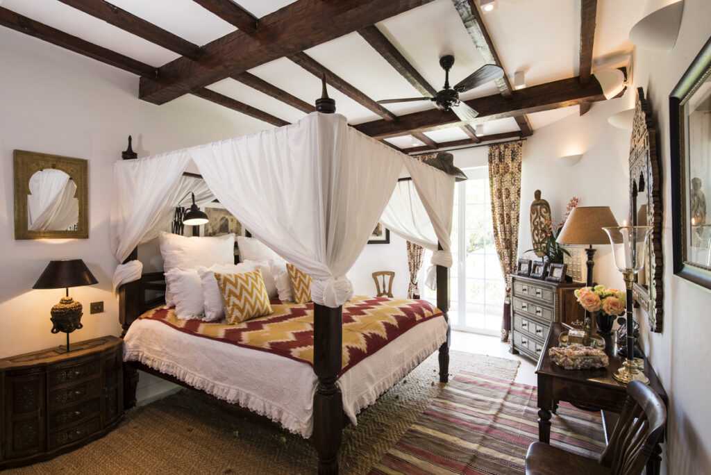 В спальне в колониальном стиле необходимо подходящее покрытие для окон. Плотный материал обеспечит уединение, но также станет дополнительным украшением интерьера. В спальне хорошо подойдут бамбуковые жалюзи. Выбирая мебель, обратите внимание на кровати с балдахином