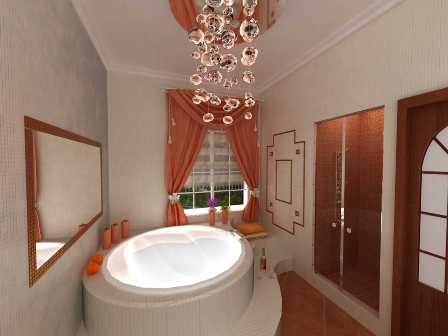Смелое сочетание бежевого и кораллового цветов в интерьере ванной комнаты.
