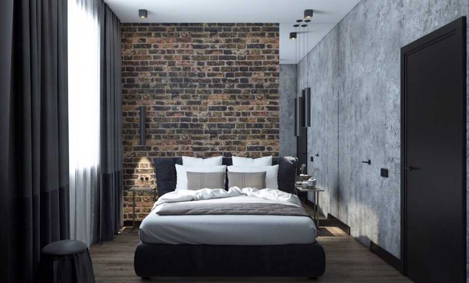 Пример сочетания оттенков серого, коричневого и бежевого в интерьере спальни.
