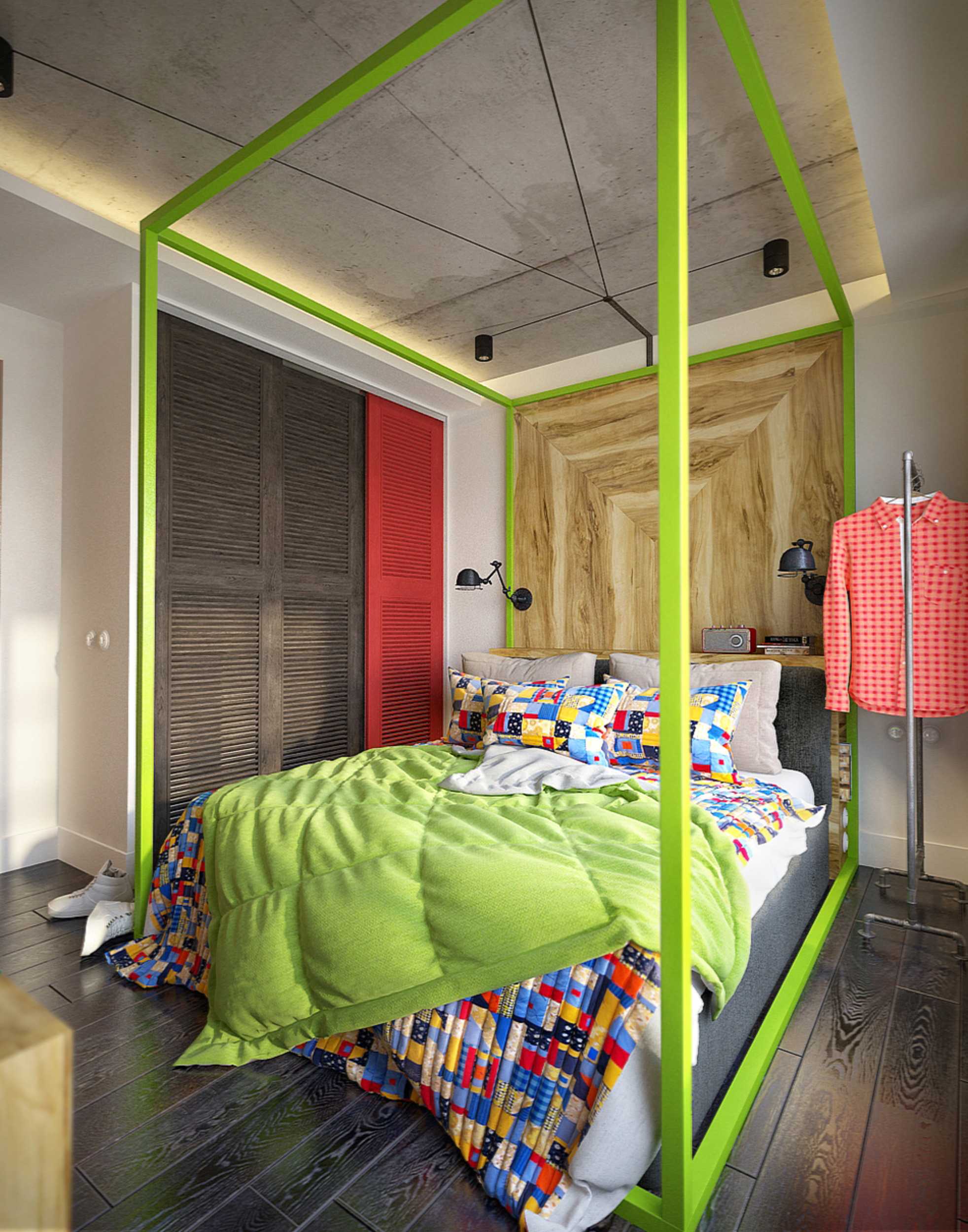 А можно ограничиться декором кровати — металлическими поручнями или наклейками.