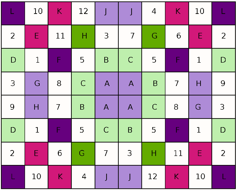 Комбинировать лоскутные составляющие будем по схеме ирландского квадрата. Она практична и универсальна, легко пересчитывается под требуемые размеры одеяла. Цепочка, составленная из квадратов, может быть как одинарной, так и двойной или тройной. Это зависит от вашего выбора. На свободных участках отлично будет смотреться вышивка или аппликация.