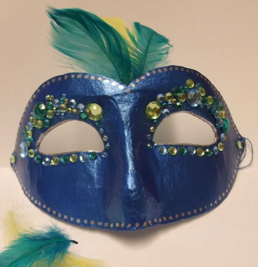 - Затем, как в первом варианте, нужно вырезать отверстия для глаз (рта, носа). После раскрасьте маску, приклейте или пришейте к ней элементы декора (бусы, ленты) и прикрепите ленту-завязку.