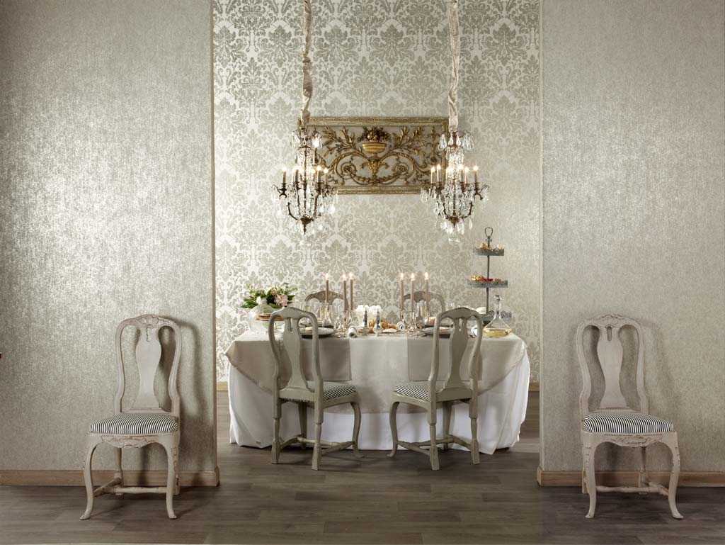 Очень интересно будут смотреться обои, имеющие золотистые или серебристые переливы с глянцевой поверхностью. В этом случае дополнительное декорирование обеспечивается за счет оформления подходящими рейками или молдингами. С их помощью можно сделать необходимый акцент на поверхности стен. Этот декор будет смотреться очень оригинально и интересно. Обои дамаск от бренда Sirpi: