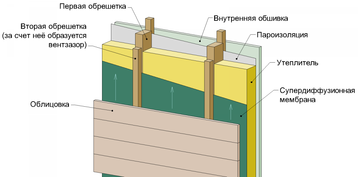 Обрешётка потребует несколько сантиметров полезной площади. Комната дома станет меньше. В качестве материала понадобится брус 25*30 мм. Если дом построен из кирпича, камня или блоков, то на основание укладывают плёнку для пароизоляции и утеплитель. В деревянных домах плёнку не используют. Она способна накапливать влагу, которая может повредить строительный материал.