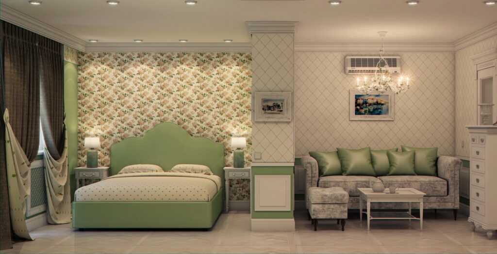 Спальня-гостиная в стиле Прованс – это территория нежности, навеянная простотой, аккуратностью и изысканностью французских деревенек. Для ее осуществления может понадобиться мебель с цветочной обивкой, однотонные или цветочные обои, обилие дерева, светло-зеленая цветовая гамма, кремовые и белесо-розовые тона.