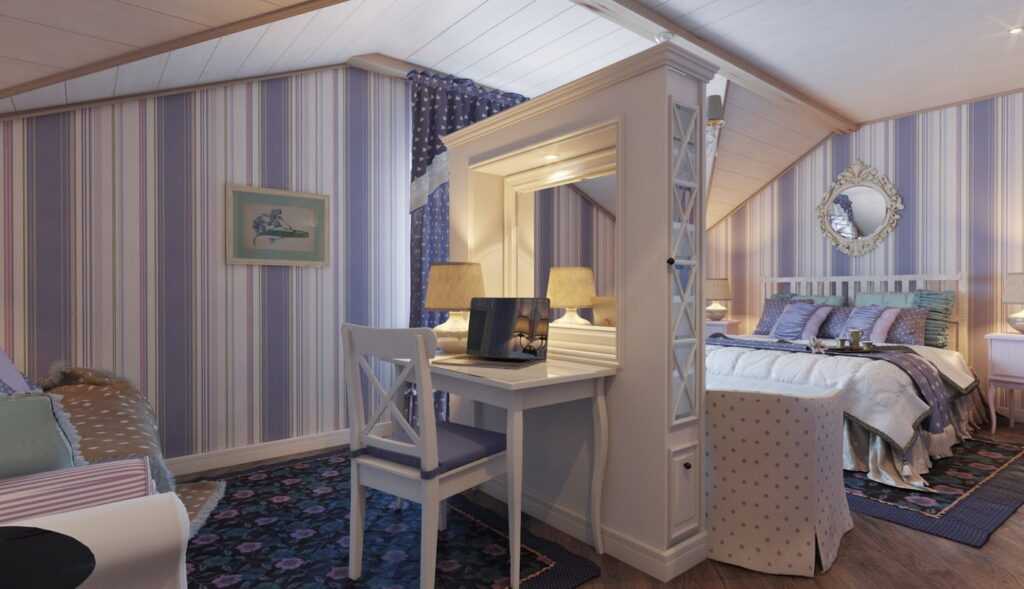 От мебели же с резными ножками и спинками стоит отказаться, дополнив интерьер классическими однотонными диванчиками. Кровать может иметь изысканное изголовье, однако его витиеватые узоры должны повториться в перегородке или подушках на диване.