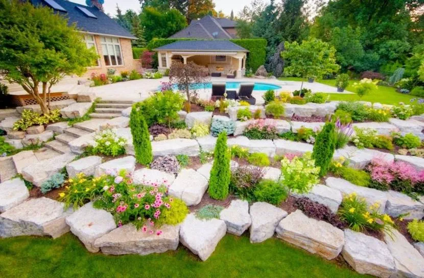 Каменная подпорная стенка на заднем дворе Источник clcdesign.com
