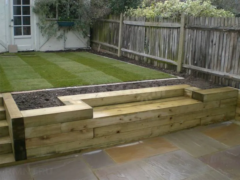 Дерево является не лучшим материалом для подобных строений из-за недолговечности. Но все же это неплохой вариант, особенно если участок находится вблизи леса. Из предварительно подготовленных бревен можно соорудить своими руками красивую подпорку для грунта:
